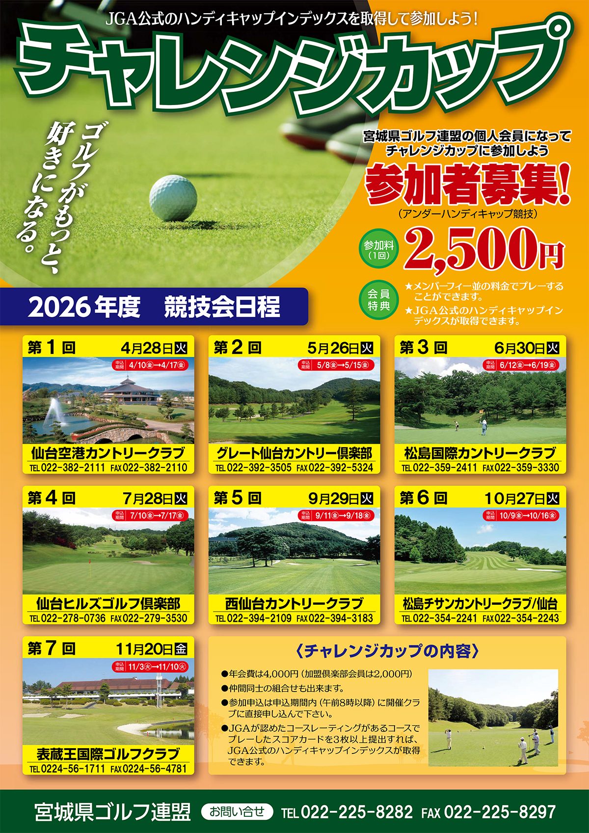 宮城県ゴルフ連盟では、個人会員を募集しております。個人会員になると、チャレンジカップに参加でき、JGA公式のハンディキャップインデックスが取得できます。